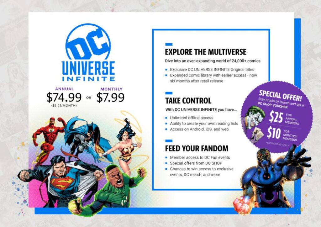 “Our fans love the platform’s robust library of comic books and, with the transformation, we will not disappoint,” said DC Publisher and Chief Creative Officer Jim Lee. “I’m excited to share that not only will DC UNIVERSE INFINITE members still be able to read all of the great comics that they’ve enjoyed but new issues are debuting on the platform quicker than before, digital first exclusives are being created, and the members-only events will begin as soon as possible. There has never been a better time to be a DC fan!”