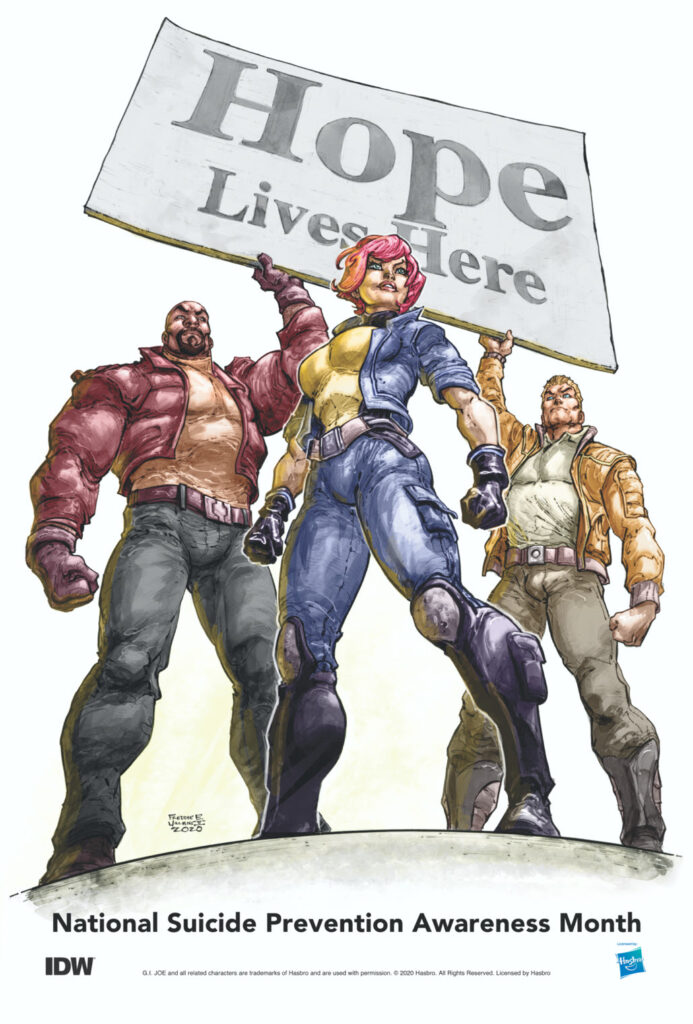 During the month of September, IDW and Hasbro have made G.I. JOE #7 available to read for free online, in an effort to spread awareness of suicide prevention and mental health. IDW also commissioned original artwork from fan-favorite artist Freddie Williams II as a public service announcement, featuring G.I. JOE characters and a banner proclaiming “Hope Lives Here”, a message of encouragement ubiquitous with suicide prevention initiatives.