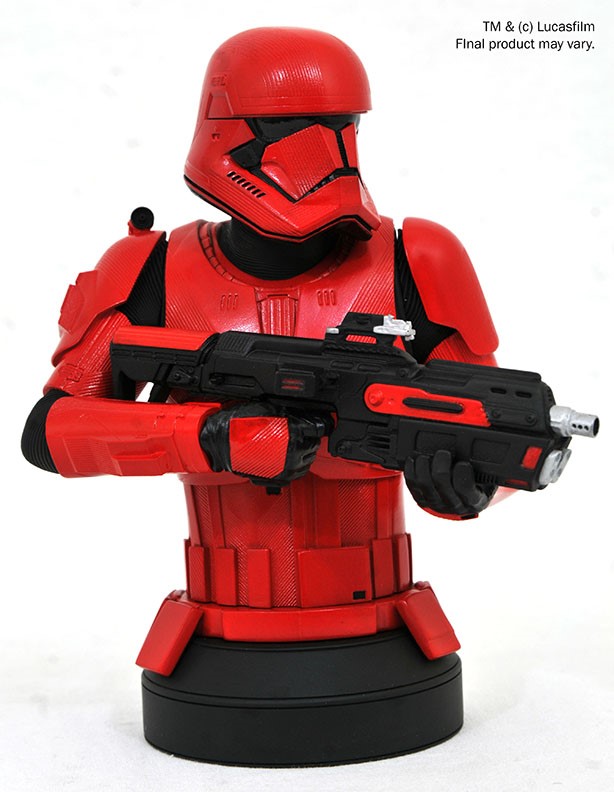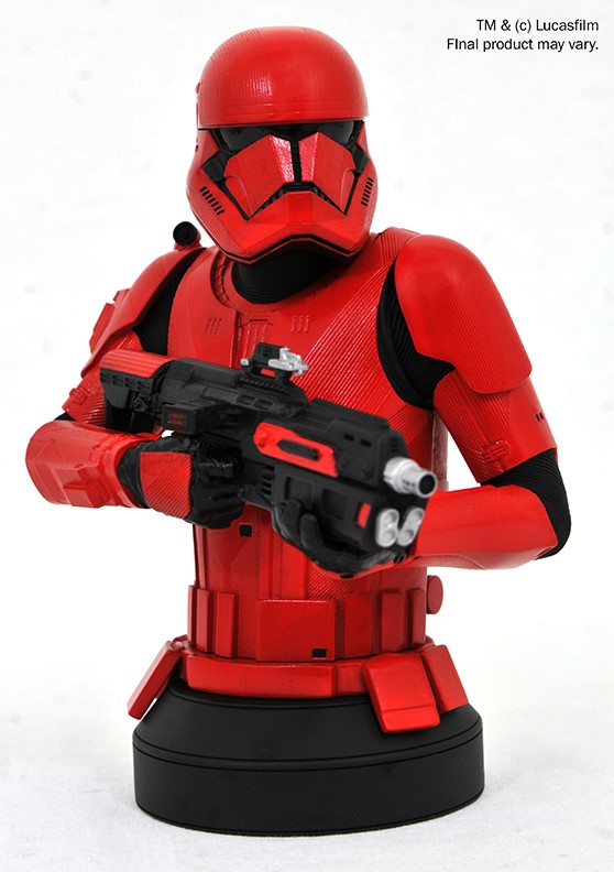 A Gentle Giant Ltd. release! Star Wars: The Rise of Skywalker has come! The new Star Wars movie introduced the world to Sith Troopers, with their distinctive red armor, and this new mini-bust depicts one wielding a matching blaster rifle. Measuring approximately 6 inches tall, this 1/6 scale bust features detailed sculpting and paint applications and comes packaged in a full-color box with a numbered certificate of authenticity. Designed by Joe Allard, sculpted by Gentle Giant Studios. (Item #FEB202400, SRP: $120.00)
