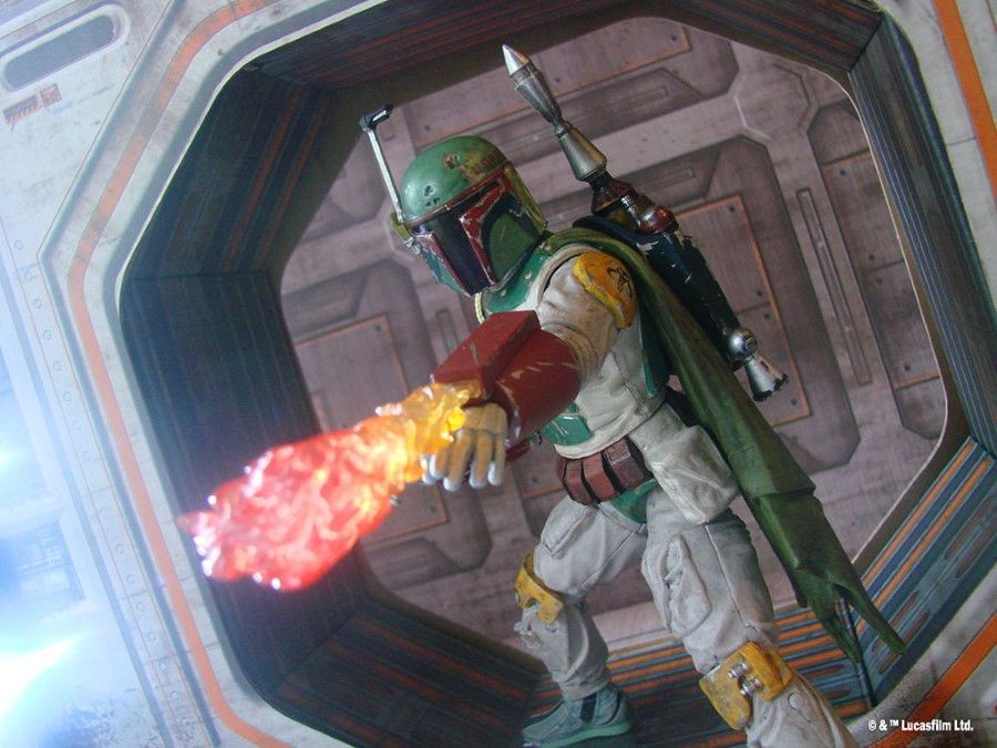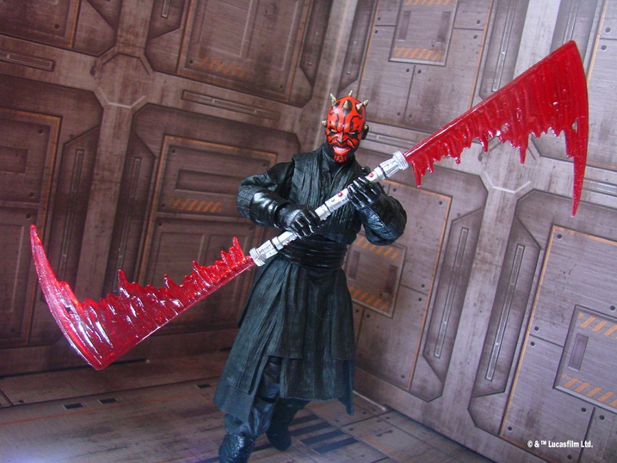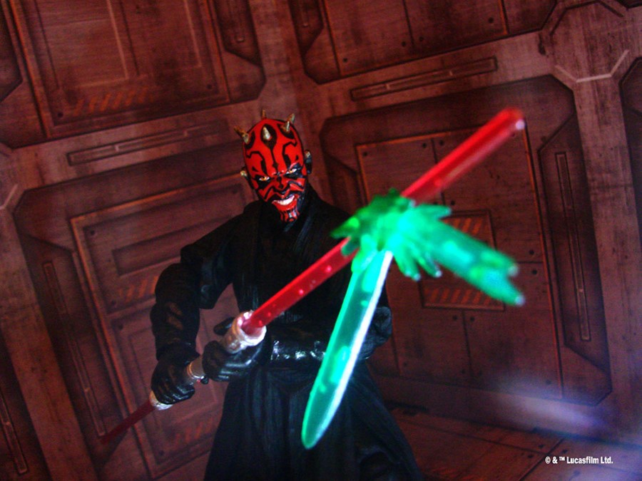 Boba Fett, the galaxy’s most famous bounty hunter, is packed with accessories, including a blaster, blast effect, flamethrower effect, twin jet thruster effects and alternate hands. Darth Maul, one of history’s deadliest Sith Lords, wields a twin-bladed lightsaber with removable blades, twirling blades and a removable connector peg for double lightsaber action, and also includes alternate hands and a deflecting laser effect.
