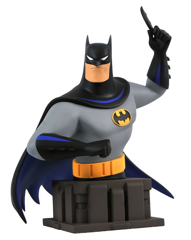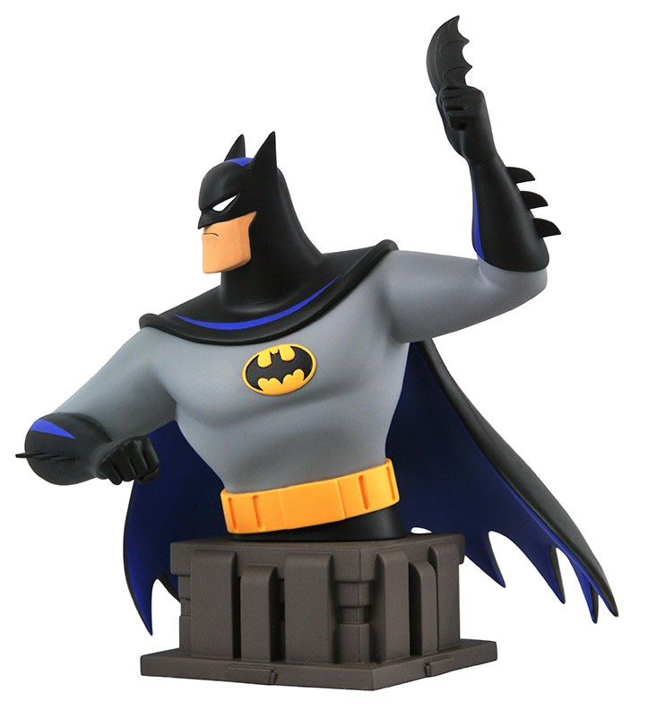 A Diamond Select Toys release! The Dark Knight returns in this new addition to the line of busts based on Batman: The Animated Series! Preparing to hurl a batarang, Batman is ready for action in this 1/7 scale, approximately 7-inch resin bust. Limited to only 3,000 pieces, it comes packaged in a full-color box with a numbered certificate of authenticity. Designed by Barry Bradfield, sculpted by Varner Studios! SRP: $59.99