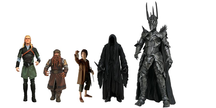 A Diamond Select Toys release! Form the Fellowship! Add the Hobbit that started it all to your 7-inch Lord of the Rings collection with this highly anticipated release! Featuring movie likeness, this approximately 4-inch figure shares the series with a 7-inch Nazgul/Ringwraith! Each includes character-appropriate accessories, as well as 16 points of articulation, and each comes with a part of the 13-inch Sauron build-a-figure! Each figure comes packaged in a full-color window box with hangtag. Designed by Yuri Tming and Eamon O’Donoghue, sculpted by Gentle Giant Studios. SRP: $29.99 each