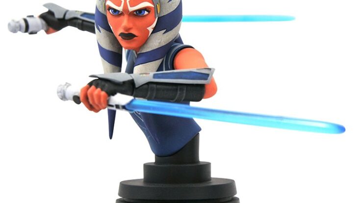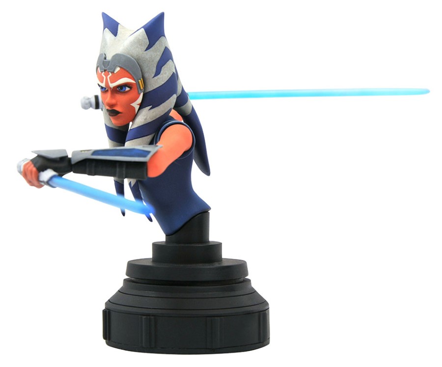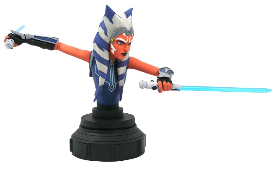 A Gentle Giant Ltd. release! Jedi Ahsoka Tano™ wields her twin lightsabers in this, her first animated-style bust! Capturing the character as she appears in the Clone Wars™ animated series, this 1/7 scale, approximately 6-inch mini-bust features detailed sculpting and paint applications. It is limited to 3,000 pieces and comes packaged with a numbered certificate of authenticity in a full-color box. Designed by Barry Bradfield, sculpted by Paul Harding. SRP: $99.00