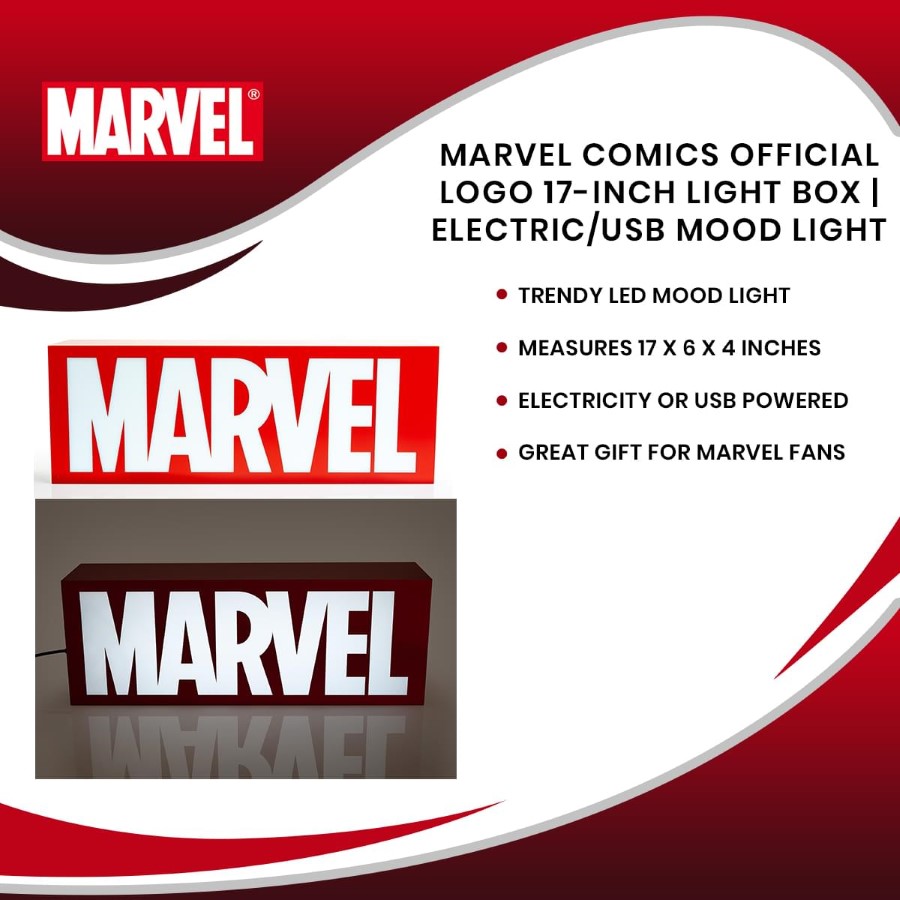 The impressive 17-inch Marvel Comics Official Logo Light Box uses energy-efficient and long-lasting LED light bulbs to illuminate your space. Convenient key mounting holes allow you to easily hang this fun piece of decor on your wall. This versatile lightbox can be powered using either USB or AC with the included cords.