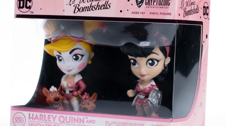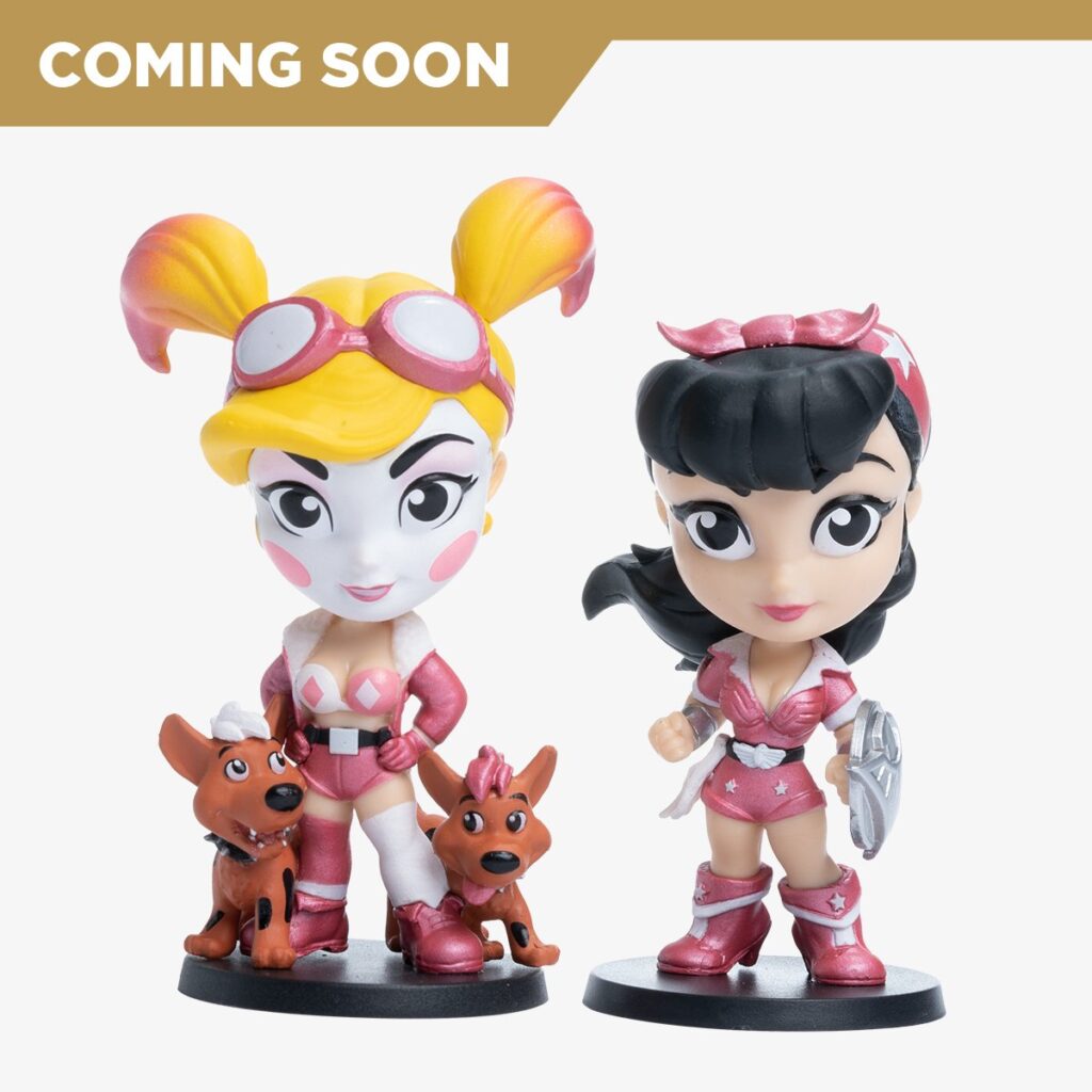 Harley Quinn and Wonder Woman Powerful in Pink Edition are variants of the regular Harley Quinn and Wonder Woman DC Lil Bombshells. Part of Cryptozoic’s Powerful in Pinkvariant series, they boldly feature the color pink! Each figure is individually hand-numbered (from 1 to 300) on the bottom. Designed by Pedro Astudillo and sculpted by Sam Greenwell, the 2.75-inch collectibles come packaged in a window box featuring foil accents.