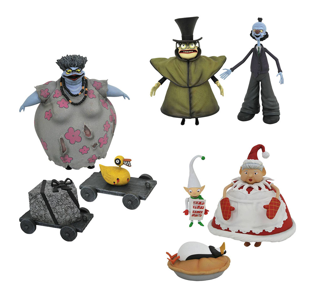 A Diamond Select Toys release! This is Halloween! Some of Halloween Town’s creepiest citizens come out of the woodwork for this series of Nightmare Before Christmas Select action figures! Mr. Hyde with Corpse Dad, Corpse Mom with Duck Gift, and Mrs. Claus with Choir Elf each feature multiple points of articulation and include various scary and/or festive accessories. They each come packaged in Select action figure packaging, with side panel artwork for shelf reference. Designed by Eamon O’Donoghue, sculpted by Cortes Studios. (Assortment, Item #FEB211929, SRP: $29.99/ea.)