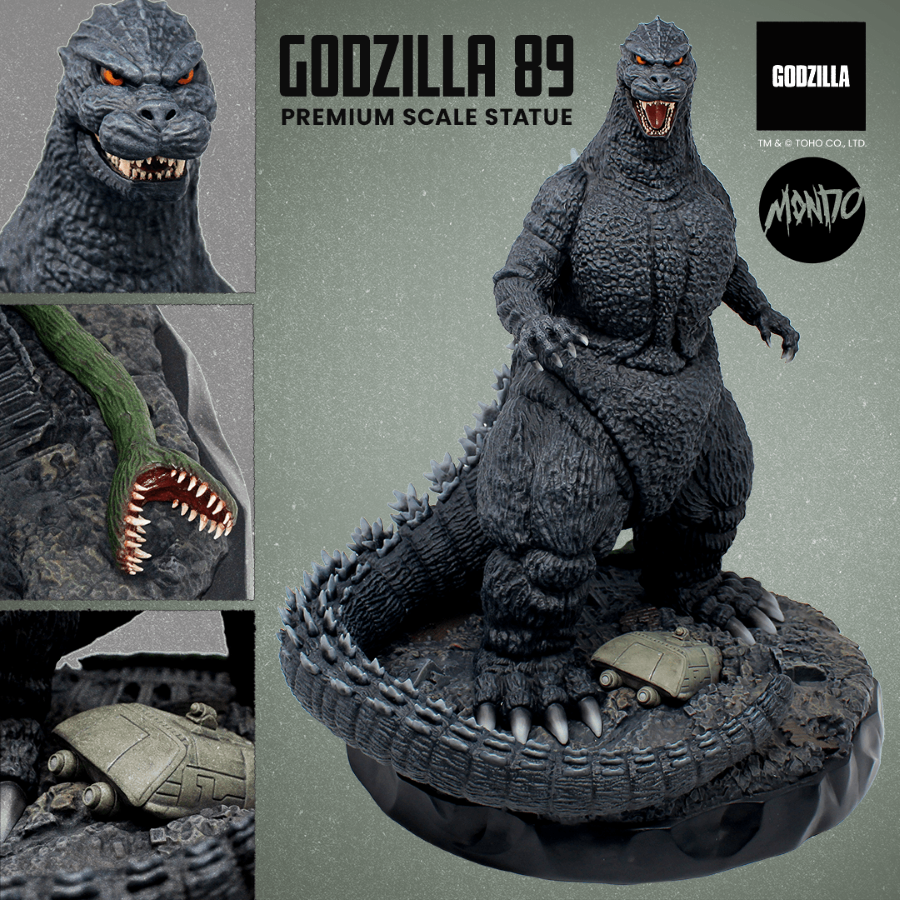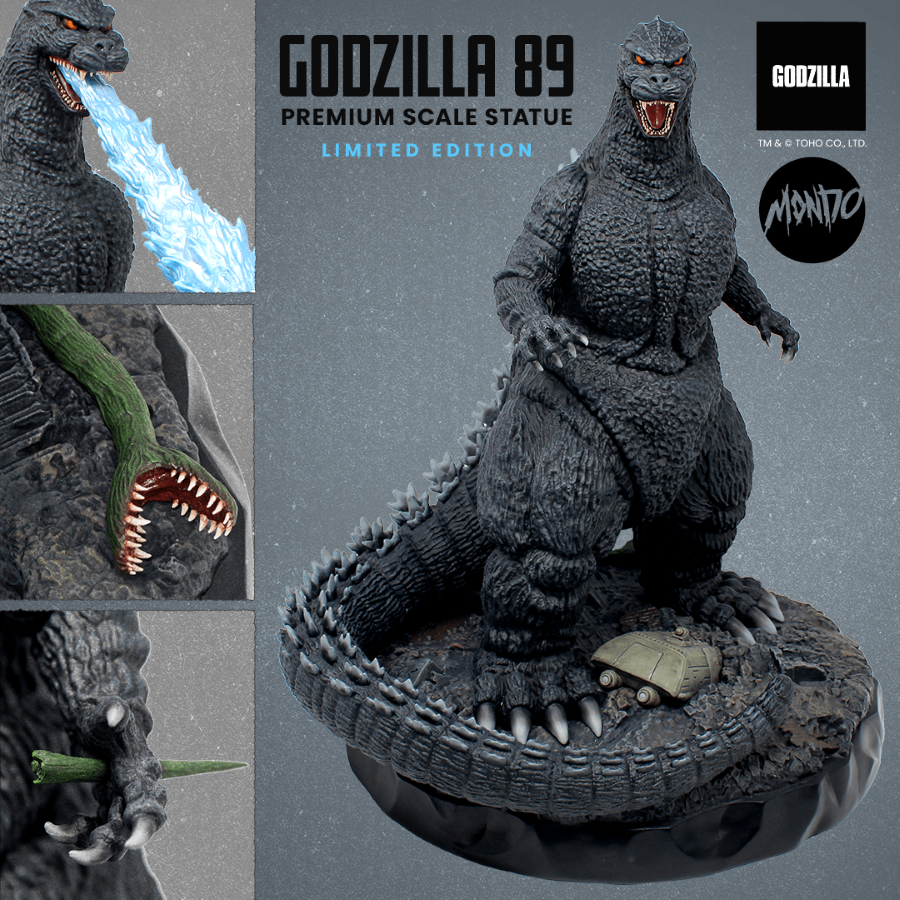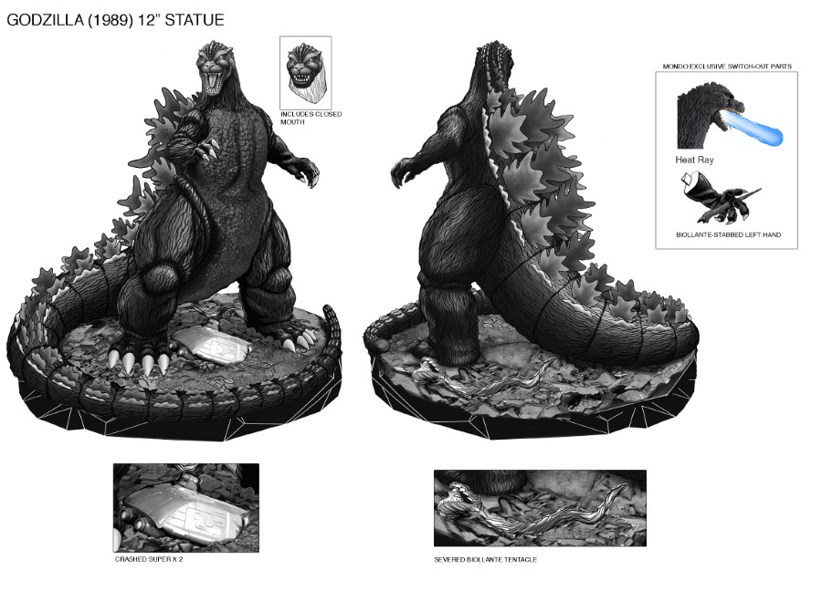 Mondo has introduced their largest collectible to date – a statue of Godzilla based on the 1989 film “Godzilla vs. Biollante”. In this film Godzilla battles a tentacled monster made from the cells of a plant and a woman. This statue, sculpted by Mark Newman and Hector Arce, designed by Eric Siebenaler, and painted by Hector Arce comes with a switch-out mouth (open or closed). Also available, as supplies last, is a LIMITED EDITION (with only 300 pieces produced) , which comes with the aforementioned switch-out mouth, as well as a switch-out Heat Ray and a battle-damaged arm, wounds inflicted by vicious vegetable Biollante. The regular edition is priced at $350 and is available for pre-order now and the limited edition is priced at $375.