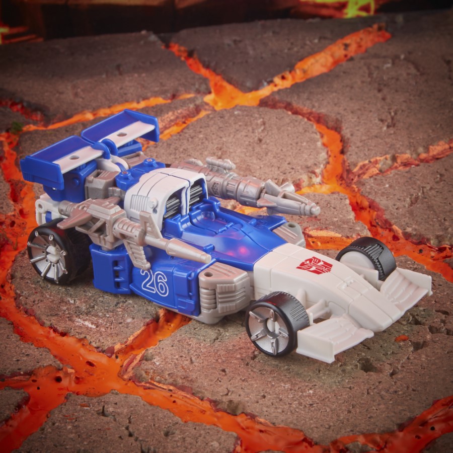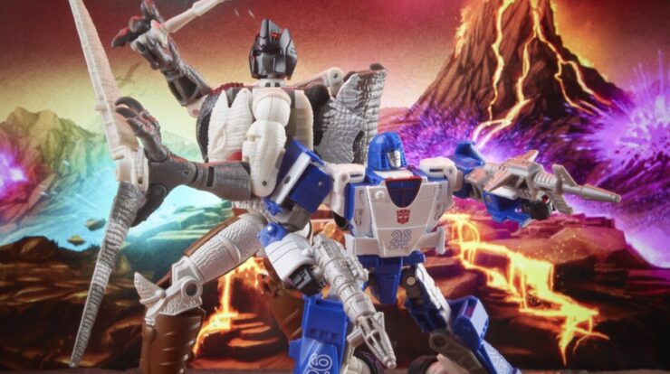 Yesterday Hasbro revealed a new Transformers War for Cybertron: Kingdom 2-pack of Mirage and Maximal Grimlock. The ‘Battle Across Time Collection’ includes a G1-inspired AUTOBOT MIRAGE figure standing at 5.5 inches tall that converts to Earth racecar mode in 20 steps and a Beast-Wars: Uprising-inspired MAXIMAL GRIMLOCK standing at 5.5 inches tall that converts to raptor mode in 28 steps. The figures come with 2 blaster accessories and MAXIMAL GRIMLOCK’s tail detaches from raptor mode to become 2 sword accessories.
