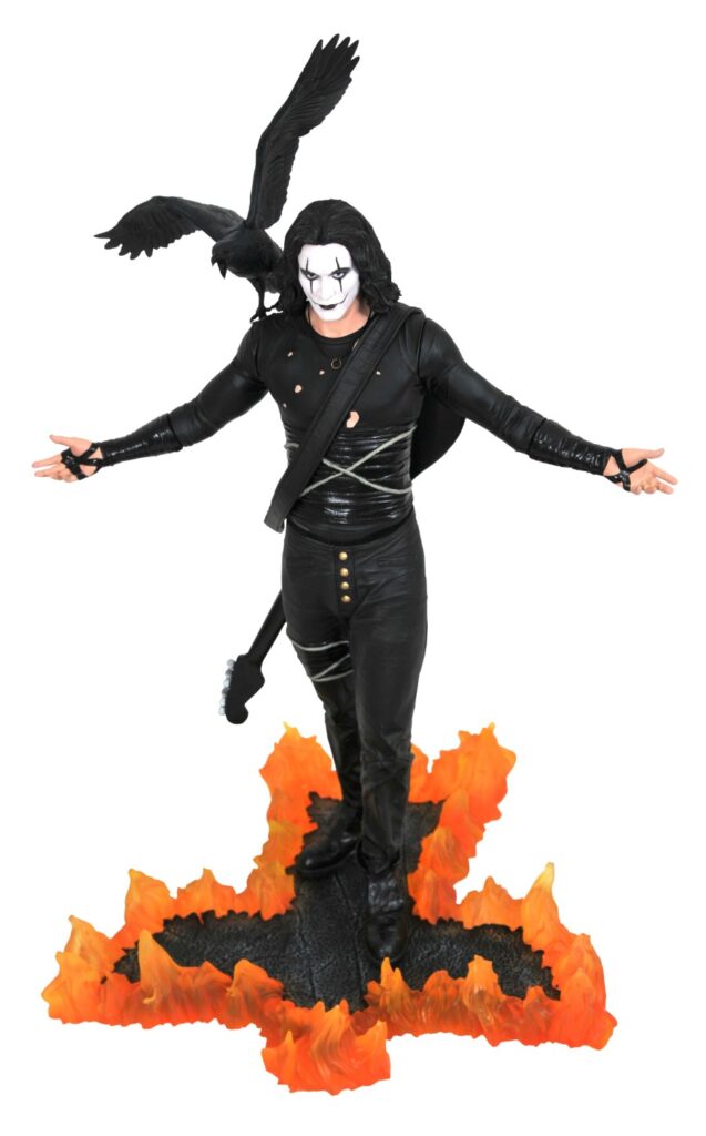 A Diamond Select Toys release! Eric Draven returns as an all-new 1/7 scale Premier Collection Statue! Based on the movie The Crow and measuring approximately 11 inches tall, this statue depicts Eric atop a flaming crow-design base, with his guitar slung across his back and the titular crow alighting on one arm. Limited to only 3,000 pieces, it comes packaged in a full-color box with a numbered certificate of authenticity. Designed by Caesar, sculpted by Rocco Tartamella! SRP: $175.00