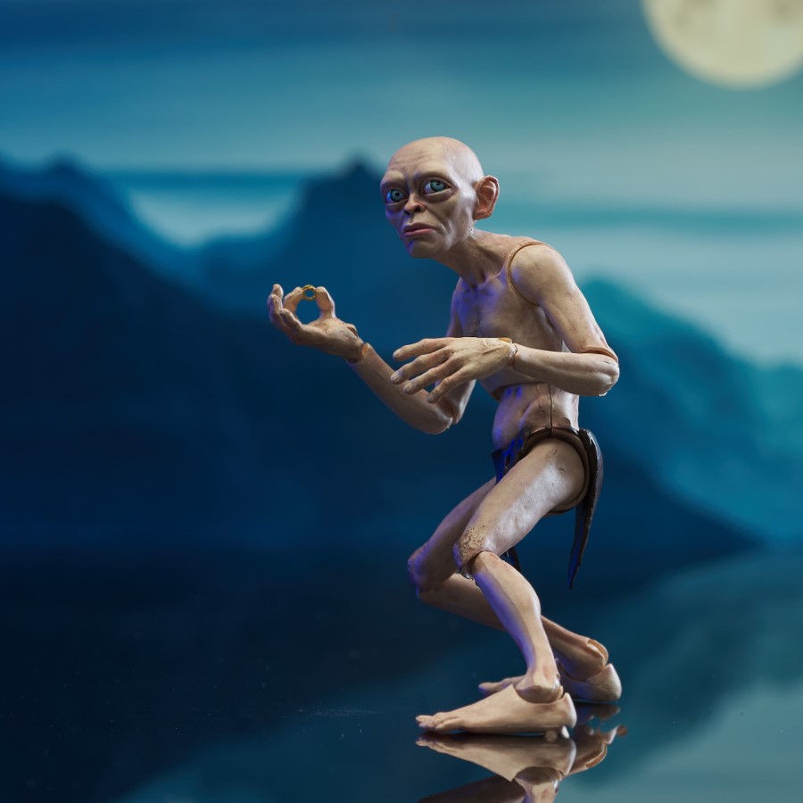 A Diamond Select Toys release! Gollum gets the deluxe treatment in this new action figure release! Based on his appearance in the Lord of the Rings trilogy, Gollum comes packaged with three interchangeable heads, interchangeable hands, a rock formation to climb and perch on, plus other bonus character accessories, including a fish, an axe for Gimli, and knives for Legolas and Aragorn! Gollum features 16 points of articulation, detailed sculpting and paint, and comes packaged in a full-color window box. Designed by Eamon O’Donoghue, sculpted by Gentle Giant Studios! SRP: $39.99