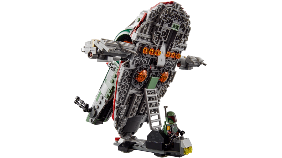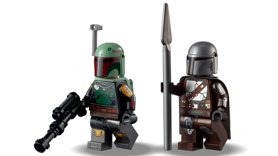 Also revealed today is Boba Fett’s ship, a $49.99 set with 593 pieces. Minifigures in this set include Boba Fett with a blaster and The Mandalorian with his blaster rifle and a beskar spear, plus a Carbonite brick to add to the creative play possibilities. The ship has a handle for easy flying, an opening LEGO® minifigure cockpit, rotating wings, 2 stud shooters, 2 rotating dual blaster cannons (non-shooting) and a compartment for a Carbonite brick. A transporter vehicle is also included to move the starship on the ground in play scenarios; this also makes a great display stand for builders to show off their creation in an upright flight position.