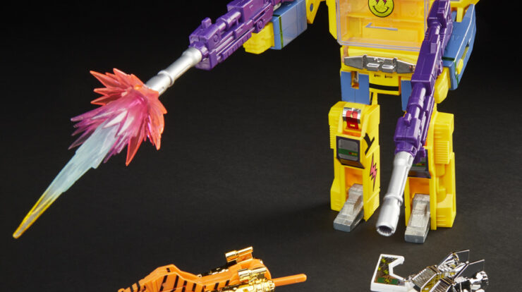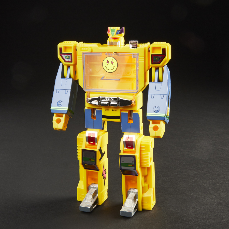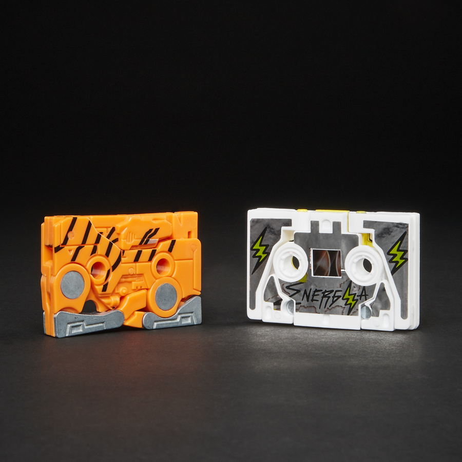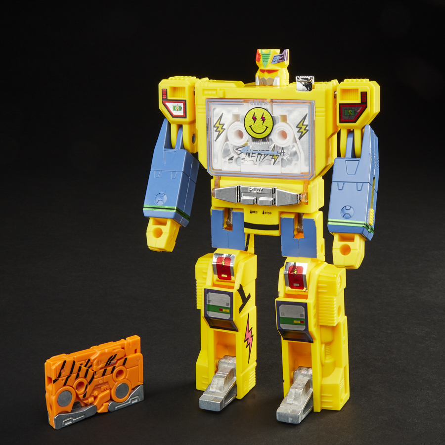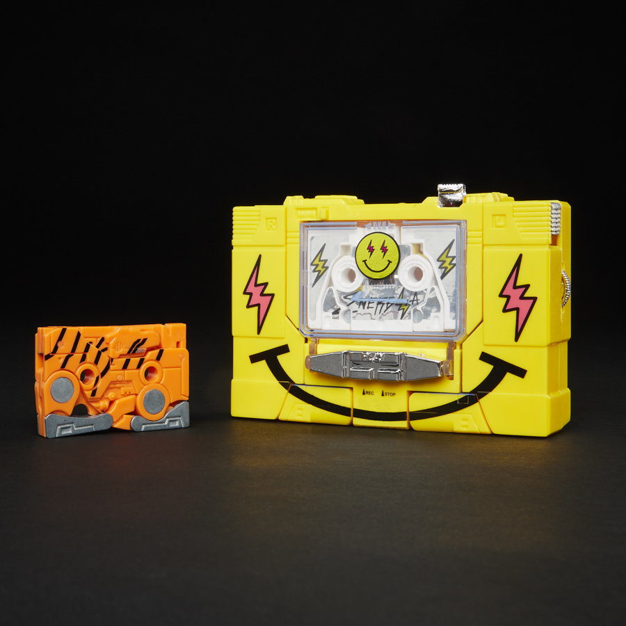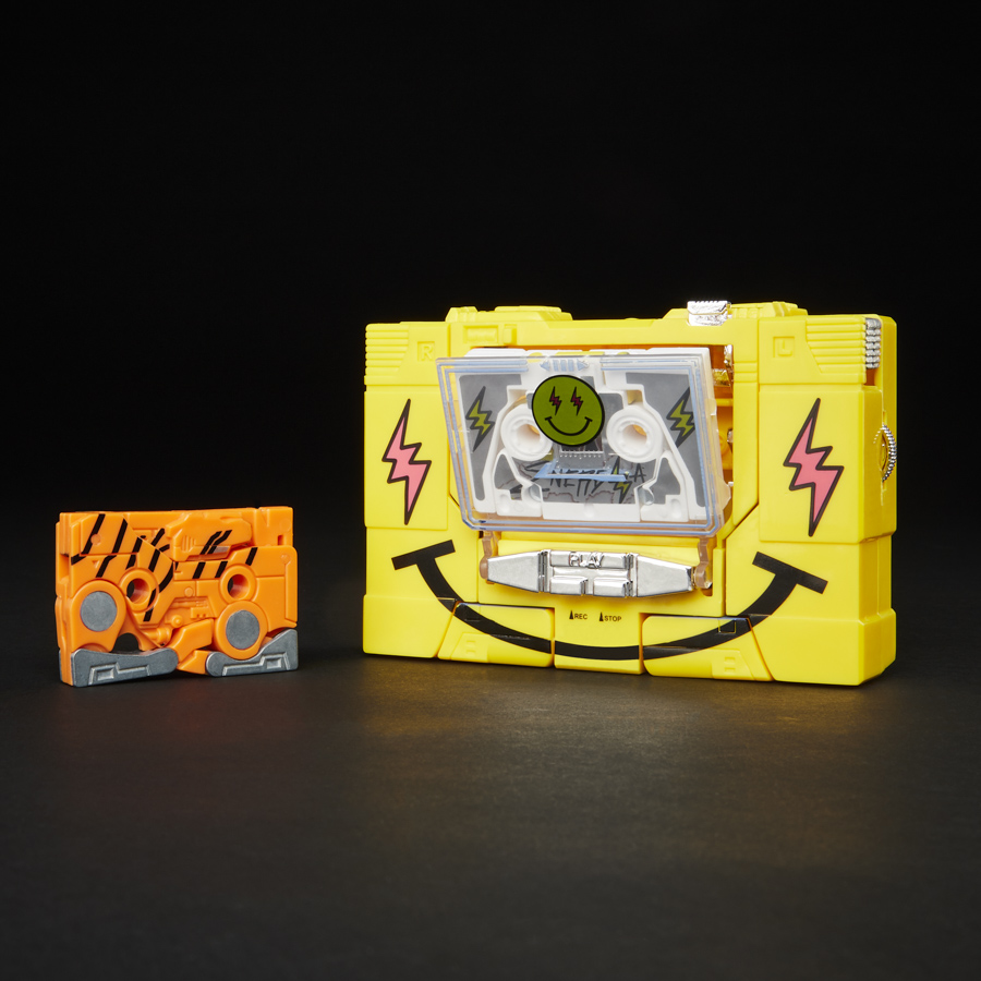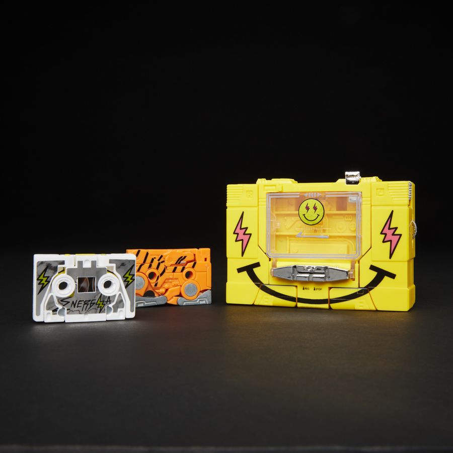Sound waves combine in this TRANSFORMERS-J Balvin mash-up pack! “Reggaeton’s global ambassador” joins the DECEPTICONS as the TRANSFORMERS robot, J BALVINTRON. This DECEPTICON wields the power of rhythm to crush his enemies! The 7-inch tall Soundwave-inspired figure converts into cassette player mode in 6 steps and features deco and details inspired by J Balvin – including packaging inspired by J Balvin’s rainbow color scheme and his iconic smiley face icon with lightning bolt eyes. He comes with two mini cassette figures, with deco inspired by albums “Energia” and “Vibras”. The Energia Buzzsaw converts to condor mode in 4 steps, and Vibras Stripes converts to tiger mode in 3 steps. The figure also includes a blaster accessory and two rainbow blast effects.
