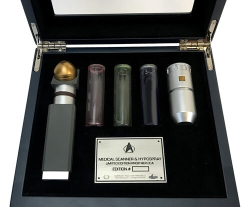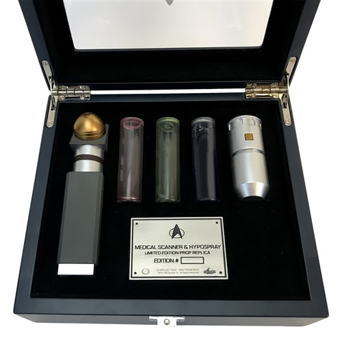 This 1:1 scale set replicates two iconic props used by 24th century physicians in Star Trek: The Next Generation. It consists of a Hypospray (with interchangeable vials) and a Hand Scanner. Both feature electronic light and/or sound effects and are crafted with heavy diecast metal bodies. Each numbered limited edition museum quality replica set comes with a wooden presentation case, cast metal plaque and a certificate of authenticity/prop story booklet and will make a fine addition to any Star Trek collection.