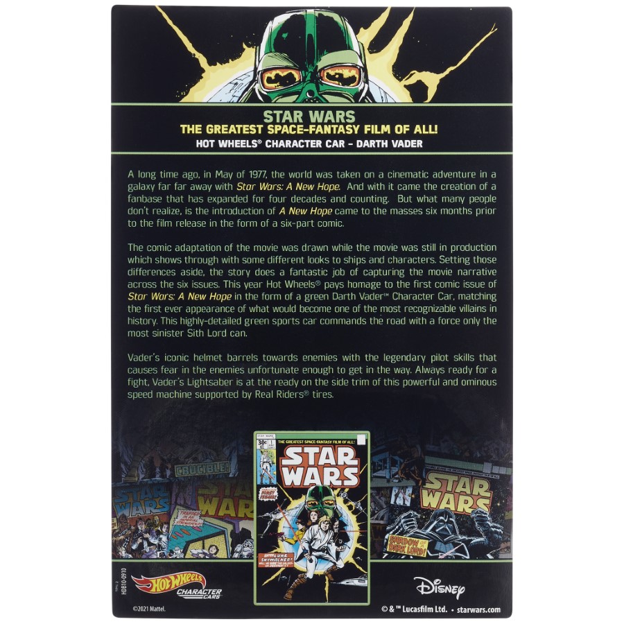 - Star Wars™ fans will want to collect this Hot Wheels® Star Wars™ Green Darth Vader™ Character Car — or turn green with envy! Based on the iconic Star Wars #1 comic book cover that features the super villain in green, this unique vehicle is an instant collectible!