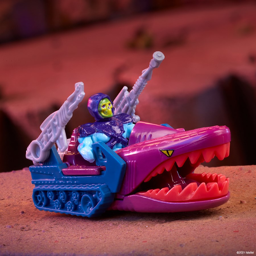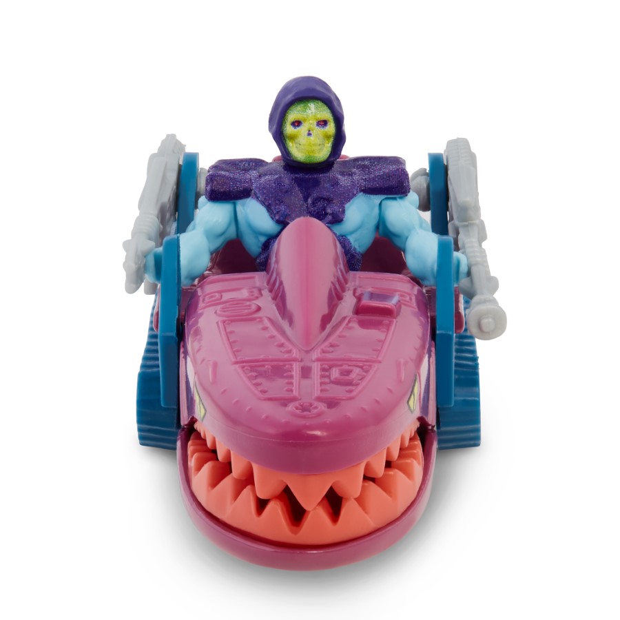 - The Wind Raider sports the original signature olive-green hull, dark yellow wings, and skull deco and comes with He-Man® mini figure to ride the Wind Raider to victory. A fuchsia shark grazes the front of the Land Shark and features a Skeletor™ action figure at the helm with the mounted weapons on the back.
