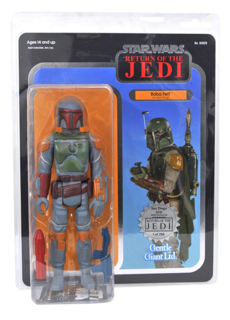 A Gentle Giant Ltd. release! Silver foil accents adorn a classic Return of the Jedi blister card commemorating the upcoming 40th Anniversary of one of the greatest sequels of all time. Packaged in a re-sealable clam-shell blister our limited edition Boba Fett has a newly updated glossy sheen that more closely resembles the luster of its original 3 ¾” counterpart. Recreated from authentic Kenner figures and 3D scanned geometry, this 12” scaled Boba Fett retro-collectible features a blaster and a firing rocket. Just like it was when you were a kid… only bigger!