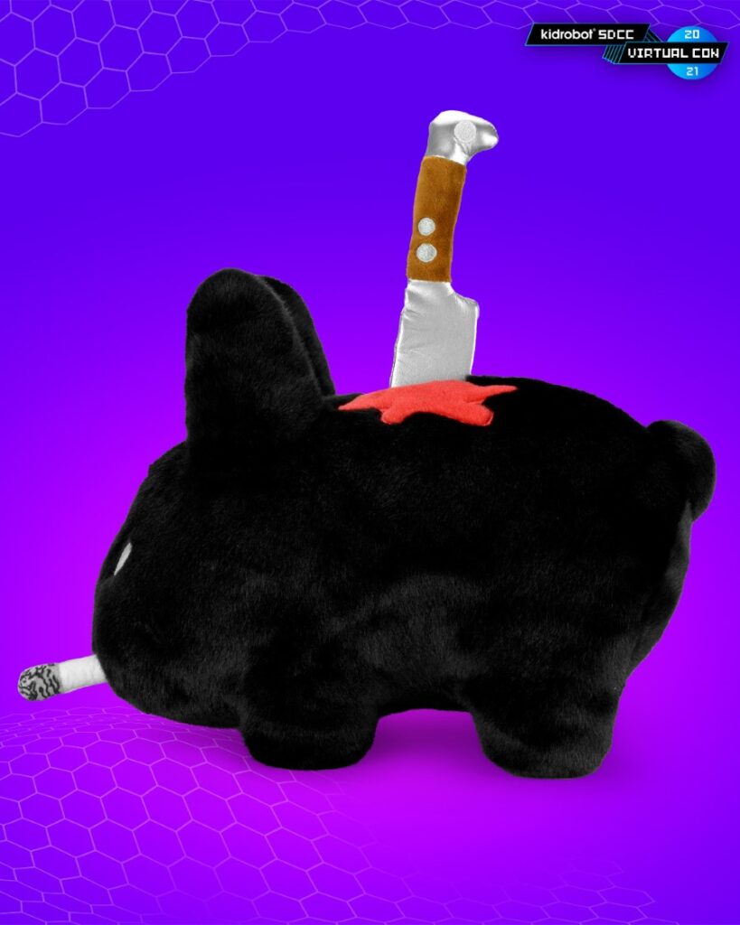Perhaps he was involved in a hideous kitchen accident. Or maybe he was betrayed by his closest friend. Either way, this 14” plush Backstab Smorkin’ Labbit seems entirely unfazed by the (removable) knife protruding from his back.