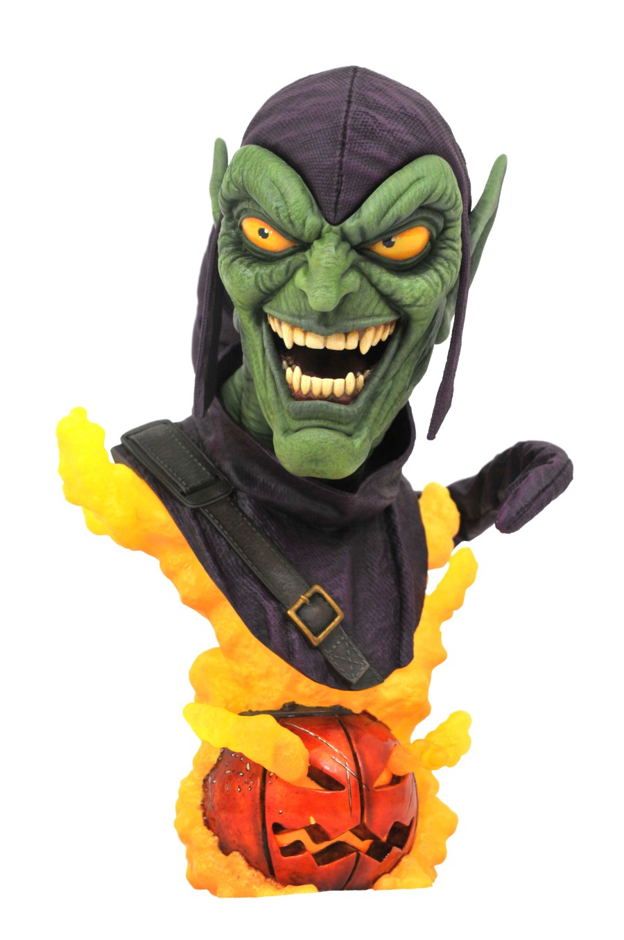 A Diamond Select Toys release! The Green Goblin is now a Legend in 3 Dimensions! The iconic Spider-Man foe gets the ½ Scale bust treatment with this all-new sculpture, capturing the grinning villain atop a smoking pumpkin bomb pedestal. Limited to only 1,000 pieces, it comes packaged with a numbered certificate of authenticity in a full-color box. Designed by Joe Allard, sculpted by Alterton!