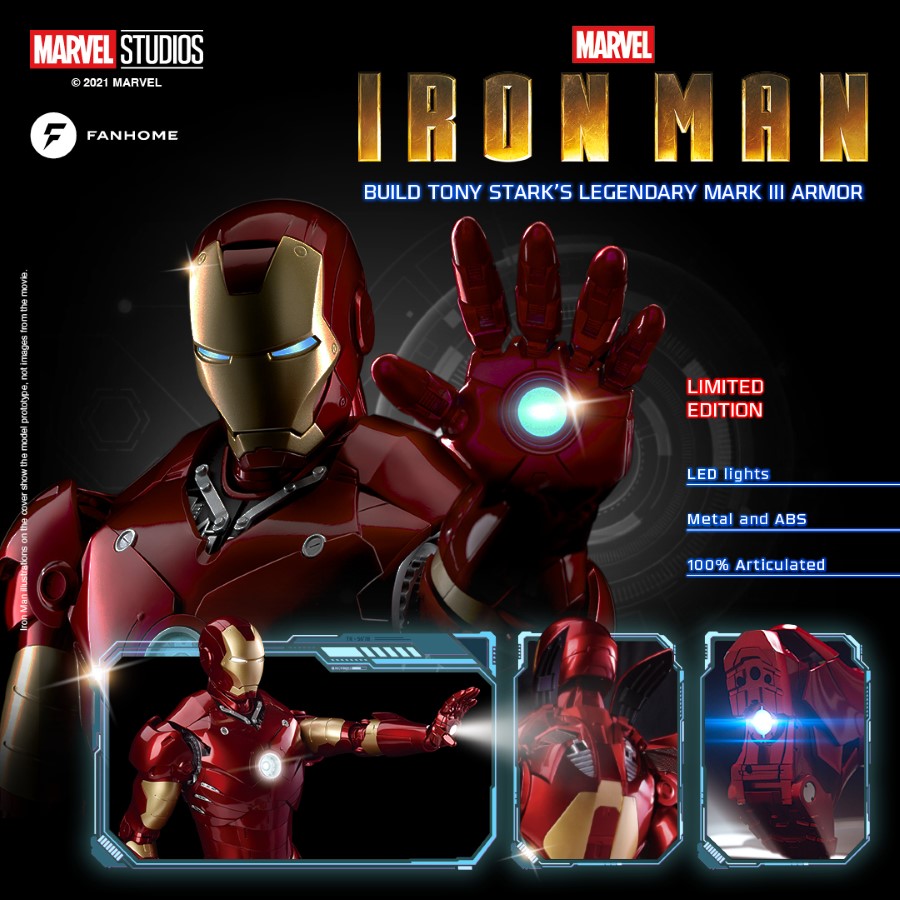 A 24-inch, original model, Iron Man model, is made of metal and high-quality ABS and completely poseable, offering a variety of movements. The reactor, hand repulsors, boot thrusters and mask visor have LED lights that illuminate on command. The build-up model’s intricate design and articulated pieces allow Marvel fans an inside view of the internal mechanisms powering the armour, making Fanhome’s Iron Man model an authentic masterpiece for collectors and modelers that no Marvel fan can resist.