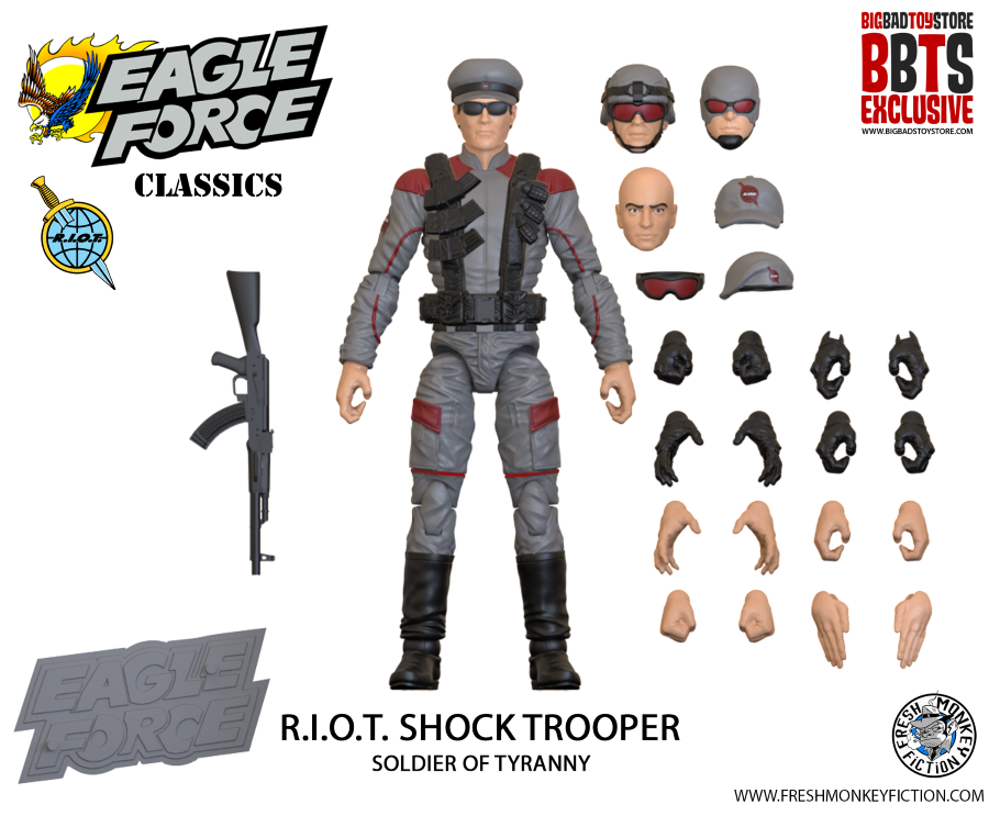 “Eagle Force fans have waited 40 years to relive the nostalgia of their youth,” said Fresh Monkey Fiction founder Bill Murphy. “Now Fresh Monkey Fiction is bringing back many of the original Eagle Force team members in their classic gold outfits, with more modern styling and articulation. The Eagle Force 40th Anniversary Action Figures BigBadToyStore exclusive action figures feature 12 figures for the initial Eagle Force Classics assortment. Many of these figures include extra trooper heads, so fans can build out their army of Eagle Force and R.I.O.T. soldiers.”