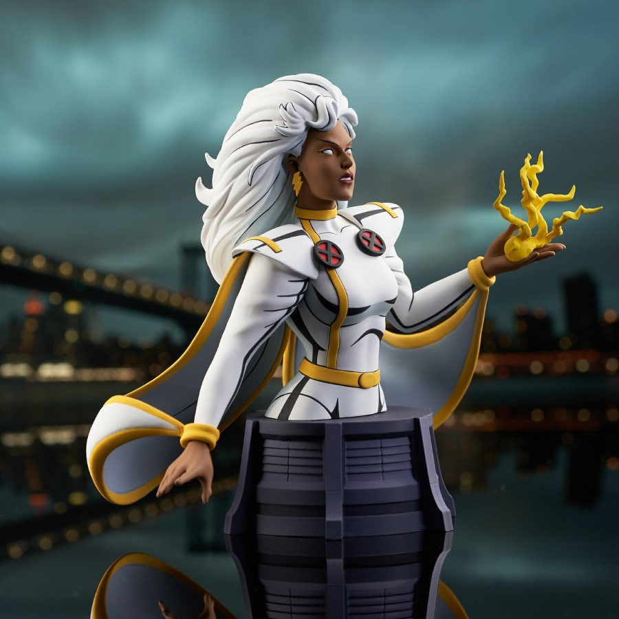 A Diamond Select Toys release! By the Goddess! The hit X-Men: The Animated Series line of mini-busts continues with the highly requested Storm! The weather-manipulating mutant wears her trademark white suit and holds a ball of lightning in her hand in this 1/7 scale, approximately 6-inch mini-bust. Limited to only 3000 pieces, it features detailed sculpting and cartoon-accurate paint applications, and comes packaged in a full-color box with a numbered certificate of authenticity. Designed by Barry Bradfield, sculpted by Paul Harding! SRP: $69.99