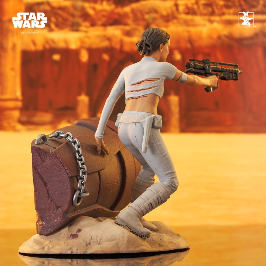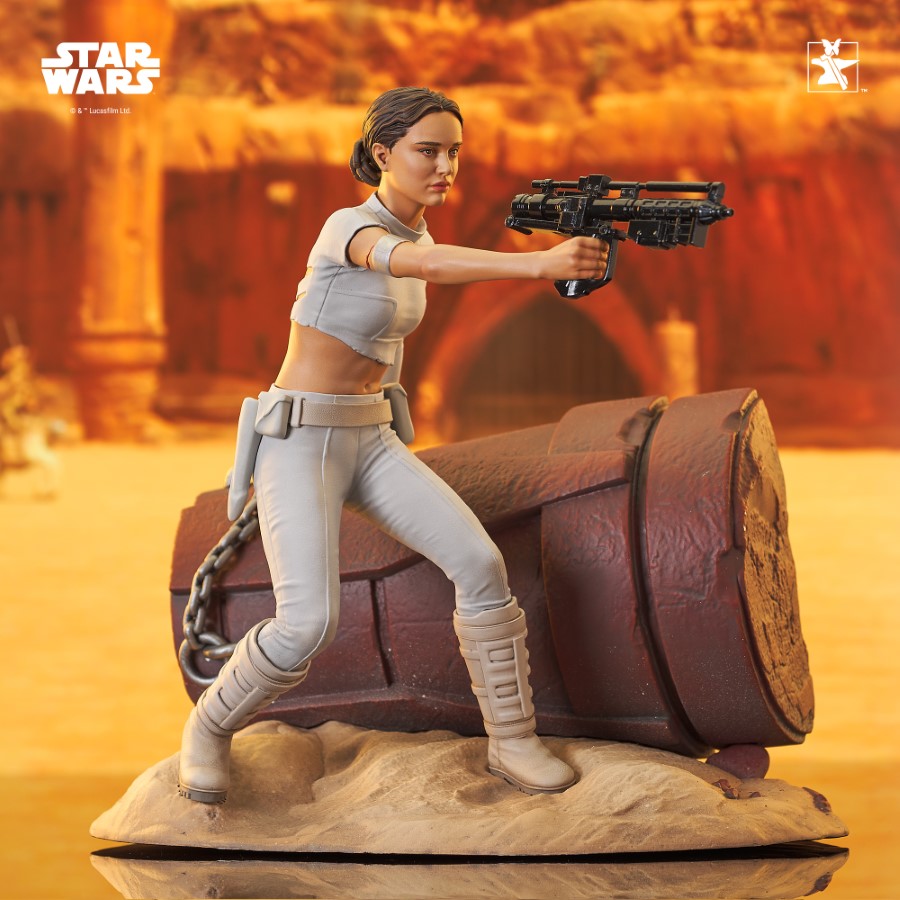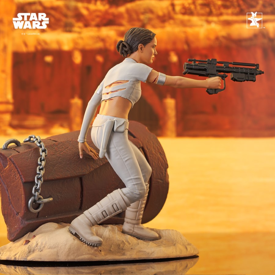 A Gentle Giant Ltd. release! All hail the Queen! Nabooan queen-turned-Senator Padme Amidala charges into battle in this new Premier Collection sculpture from the artists at Gentle Giant Ltd.! Wielding a blaster as she escapes from her chains in the arena on Geonosis, this statue of Padme features the likeness of Natalie Portman and stands approximately 9 inches tall. Limited to only 3000 pieces, it comes packaged in a full-color window box with a numbered certificate of authenticity. SRP: $199.00
