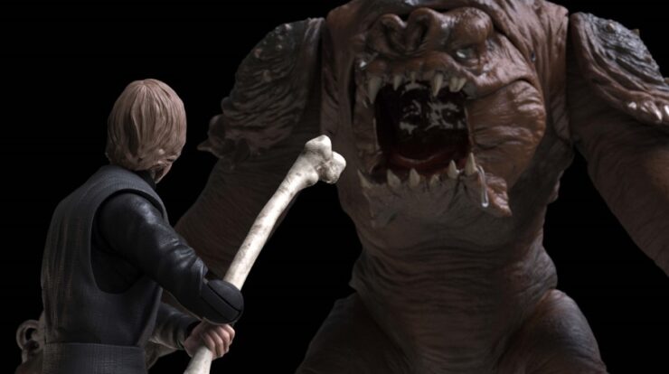 At 16,000 backers, a single carded Black Series Salacious Crumb will be included with the Rancor. At 19,000 an all-new Black Series Jedi Luke (no gloved hand!) on a Power of the Force card (with coin!) will be included.