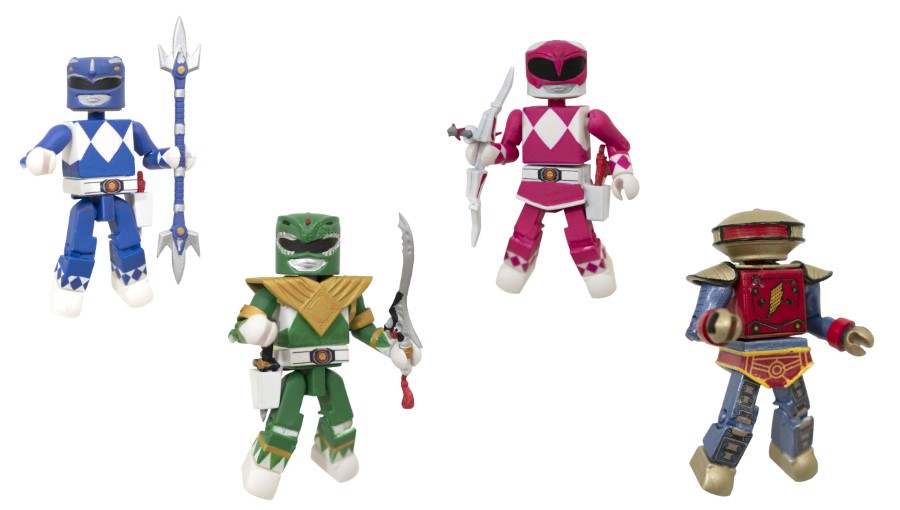 A Diamond Select Toys release! Go go Power Rangers! The Mighty Morphin’ Power Rangers are back, in an all-new format! These 2-inch Minimates figures feature 14 points of articulation, removable helmets and fully interchangeable parts and accessories! Series 1 includes the Blue Ranger, Pink Ranger, Green Ranger and robot Alpha 5! All four come packaged in a full-color window box with a fifth panel door. Designed by Barry Bradfield! SRP: $29.99