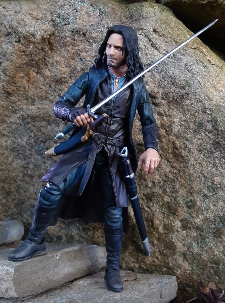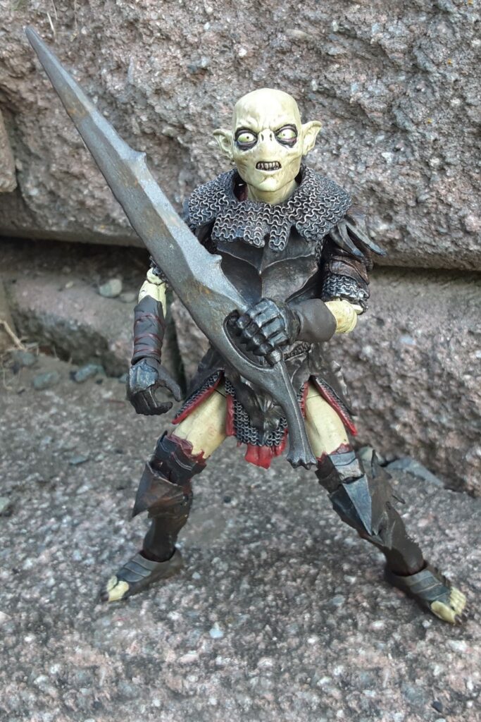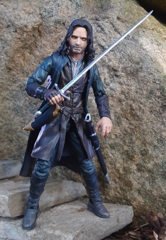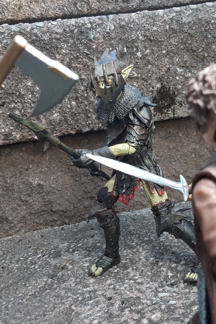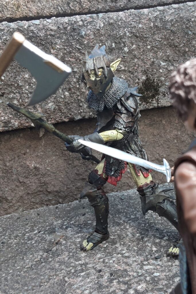 Aragorn and a Moria Orc are the two figures in this series, each with weapons and accessories – Aragorn includes a torch, his ranger sword and the sword Anduril, while the orc includes a sword, a spear, an alternate helmeted head and removable shoulder armor so you can customize different orcs!