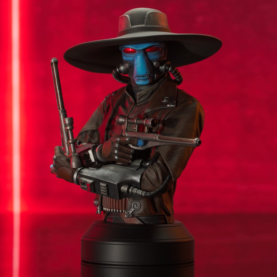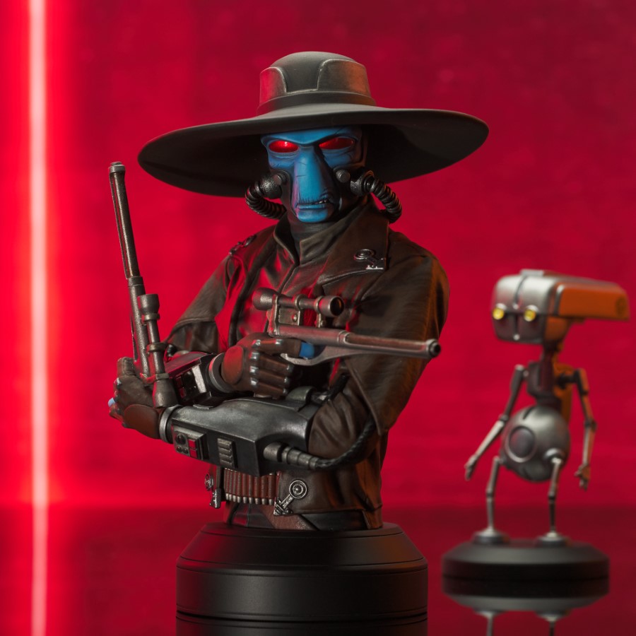 A Gentle Giant Ltd. release! The cowboy of the Star Wars Universe is ready for his close-up! This 1/6 scale resin mini-bust takes a realistic take on the Clone Wars character, showing him wielding both of his pistols as he peers out from under the wide brim of his hat. This 6-inch bust comes packaged in a full-color box, and is limited to an edition of 3000. It comes packaged with a numbered certificate of authenticity. And don’t miss the Premier-Guild exclusive Cad Bane with Todo 360 droid mini-statue!