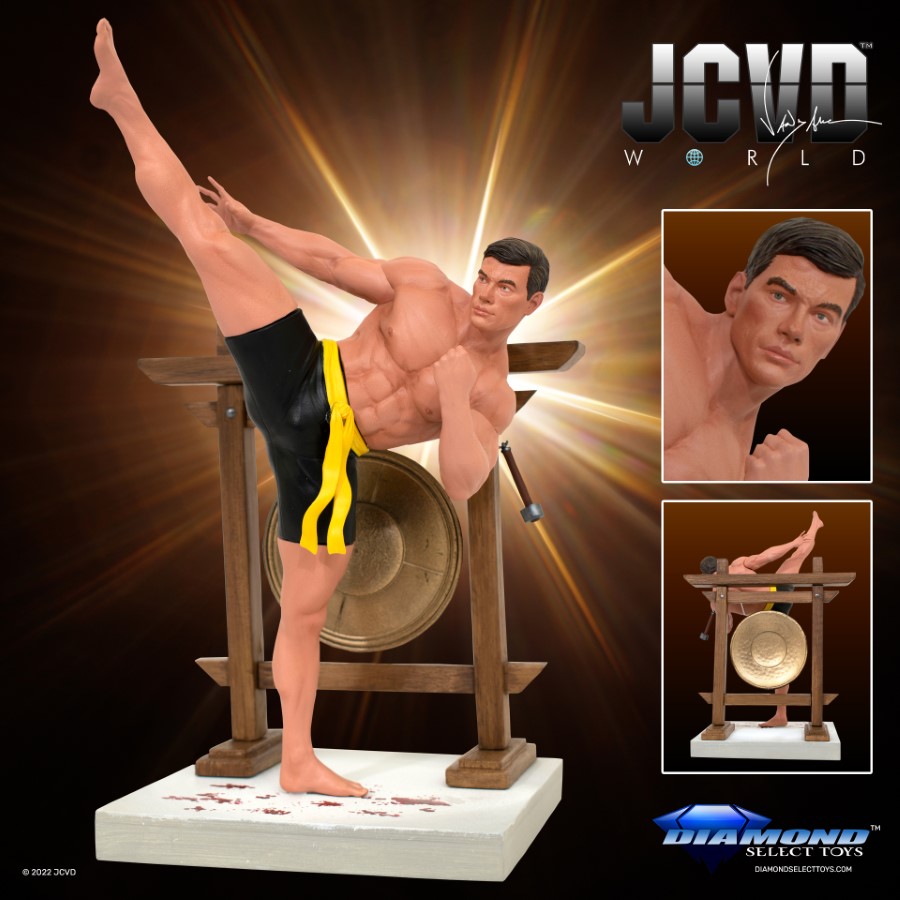 A Diamond Select Toys release! The Legend begins! Diamond Select Toys kicks off a new line of Jean-Claude Van Damme collectibles with this Gallery Diorama of the Muscles from Brussels in one of his iconic, superhumanly balanced poses! Demonstrating one of his famous high kicks in front of a gong, the young JCVD stands approximately 10.5 inches tall and is made of high quality PVC. It comes packaged in a full color window box. Designed by Eamon O’Donoghue, sculpted by Rocco Tartamella!