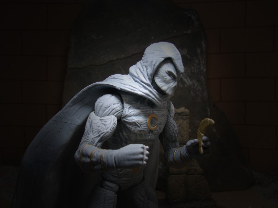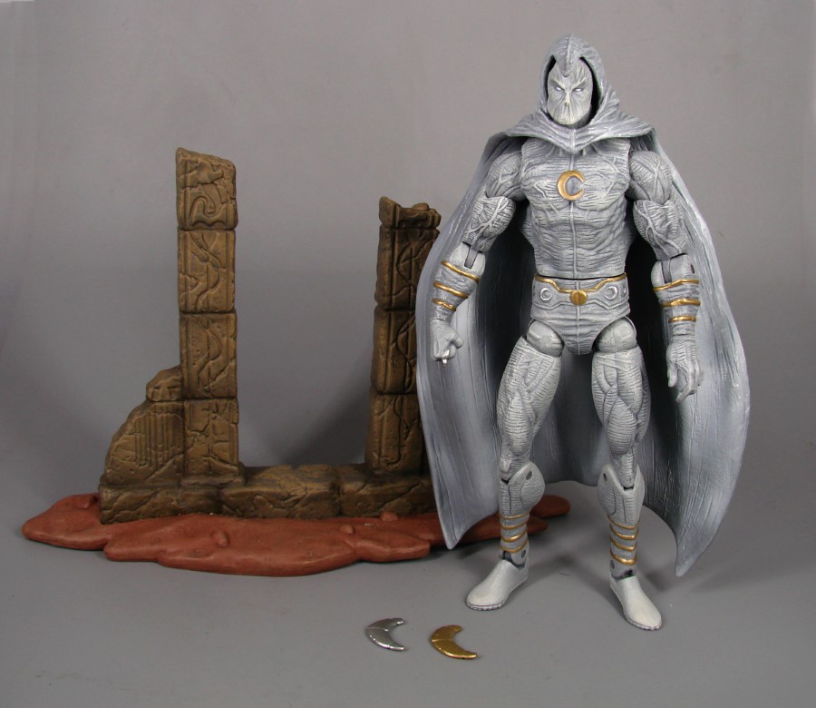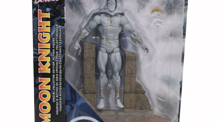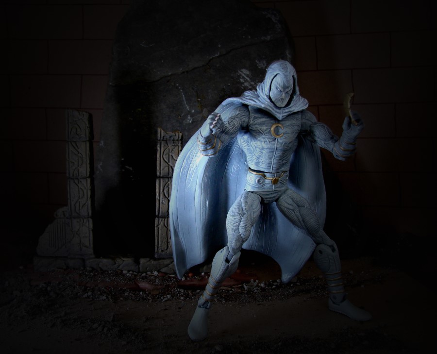Standing approximately 7 inches tall and featuring approximately 16 points of articulation, this exclusive release of Moon Knight comes with a diorama base featuring the doorway to the temple of the Egyptian moon god Khonshu. He also comes with two moon-shaped throwing knives, and comes packaged in the Select action figure packaging with side-panel artwork.