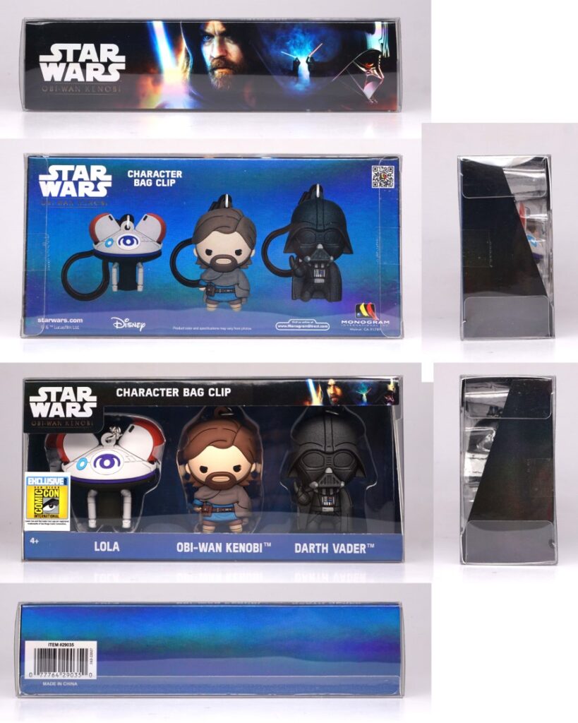 - From Lucasfilm and Disney, Monogram brings you the Obi-Wan Kenobi Character Bag Clips 3 Pc Exclusive Set to San Diego Comic Con.