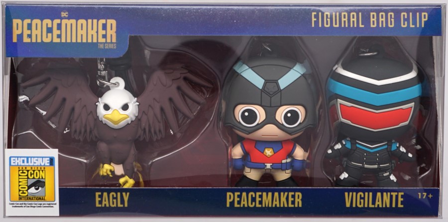 - Peacemaker 3D Foam Collectible Bag Clips 3 Pc set features Peacemaker, Vigilante, and Eagly.