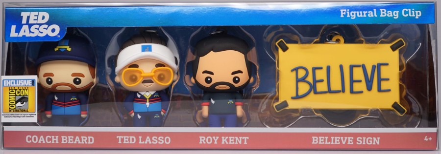 - The set includes four 3D figural bag clips: Ted Lasso, Coach Beard, Roy Kent, and the memorable BELIEVE sign.