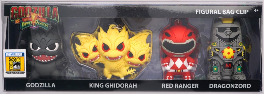- The collector’s set features Godzilla, King Ghidorah, Dragonzord, and Red Ranger in 3D foam character bag clip form.