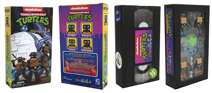 In the Teenage Mutant Ninja Turtles Minimates Retro VHS Box Set, Leonardo, Donatello, Michelangelo and Raphael each come with their trademark weapons, and sport looks inspired by the classic TMNT toys of yesteryear. Also included are four baby turtles, throwing stars, a mutagen canister and a mouser! Each 2-inch Minimate features multiple points of articulation, and all six come packaged in replica VHS packaging with a slide-out “cassette” tray and original cover art.