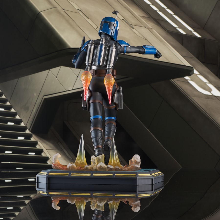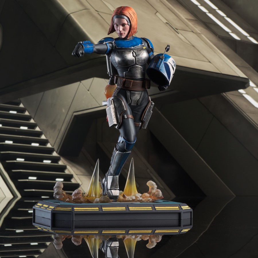 A Gentle Giant Ltd. release! For the glory of Mandalore! Mandalorian freedom fighter Bo Katan blasts her way into the Premier Collection with this dynamic, customizable statue! Featuring interchangeable helmeted and unhelmeted heads, and alternate helmet-holding and gun-holding arms, Bo Katan engages her jetpack in this 1/7 scale, approximately 11-inch statue. Limited to only 3,000 pieces, it comes packaged with a numbered certificate of authenticity in a full-color box. Designed by Barry Bradfield and sculpted by Alejandro Pereira! (MAR212001, SRP: $175.00)