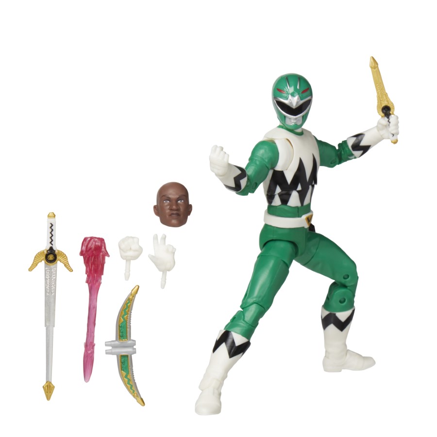 The Lost Galaxy Green Ranger includes over 20 points of articulation for high poseability, swappable heads to display the Ranger with or without his helmet, Quasar Saber (2 versions), Green Transdagger, blast effect piece, and an extra pair of hands. The Mighty Morphin’ Black Ranger includes over 20 points of articulation for high poseability, swappable heads to display the Adam with or without his helmet, Extinguisher, Blade Blaster (in 3 modes), blast effect piece, and an extra pair of hands for more ways to play or display.