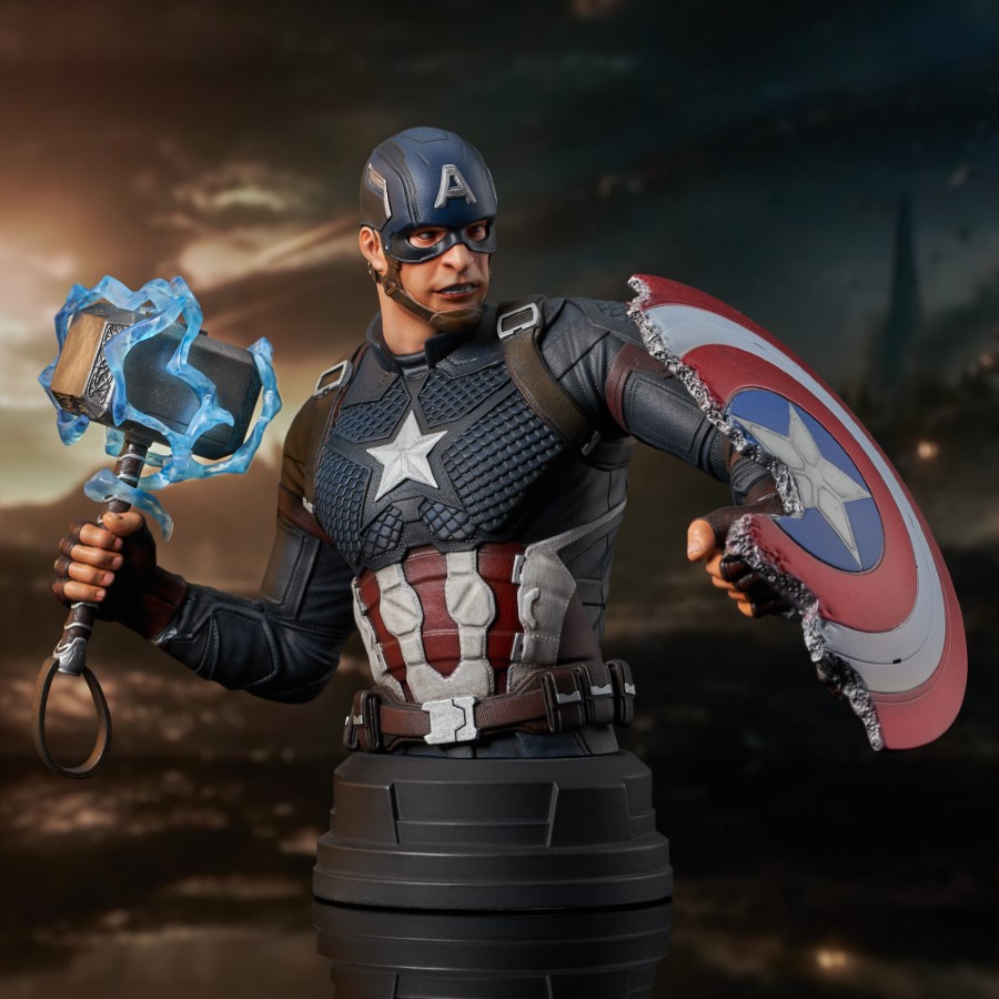 A Diamond Select Toys release! Avengers Assemble! Captain America leads the charge against Thanos with this all-new 1/6 scale mini-bust! Standing 6 inches tall, Cap wields Mjolnir while he holds his damaged shield, all atop a pedestal base. Limited to only 3000 pieces, this sculpture features detailed sculpting and paint applications and comes packaged in a full-color window box. Designed by Joe Allard, sculpted by Joe Menna! SRP: $120.00