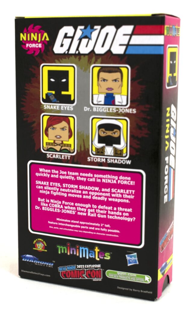 A Diamond Select Toys release! Yo Joe! The GI Joe Ninja Force team makes their Minimates debut in this exclusive 4-pack! Snake Eyes, Scarlett and Storm Shadow team up to take on the Cobra scientist Dr. Biggles-Jones, as seen in the classic GI Joe comic book series! These 2-inch Minimates feature 14 points of articulation and fully interchangeable parts and accessories, and they slide out of an illustrated VHS sleeve! Designed and illustrated by Barry Bradfield! ($30)