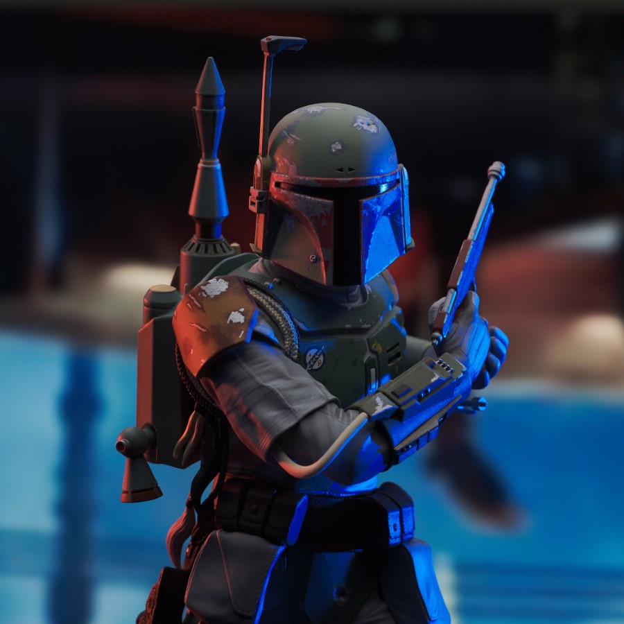 A Gentle Giant Ltd. release! He needs Han Solo alive! The bounty hunter Boba Fett gets an all-new statue in the Premier Collection line, based on his appearance in Star Wars: The Empire Strikes Back! This exclusive sculpture depicts Boba Fett descending the steps in the carbon freezing chamber, with his blaster drawn. Standing approximately 11 inches tall, this resin statue features detailed sculpting and paint applications, and is limited to only 1000 pieces. ($200)