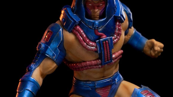 Climbing on a base formed by mechanical and technological elements, Eternia’s heroic warrior of many faces reveals himself ready for action. As a futuristic gladiator, he uses blue armor with lilac details, filled with cybernetic aspects, that cover his arms and legs, and he also brings a big helmet on his head on which his many faces appear in its front opening. Iron Studios present another statue from their successful line based on the classic MOTU franchise with “Man-E-Faces – Masters of the Universe – Art Scale 1/10”, the three-in-one hero, part man, part monster, and part robot, remarkable by his distinctive powers and look. The statue presents the same mechanism as the original figure, changing its faces when turning the gear on top of his head.