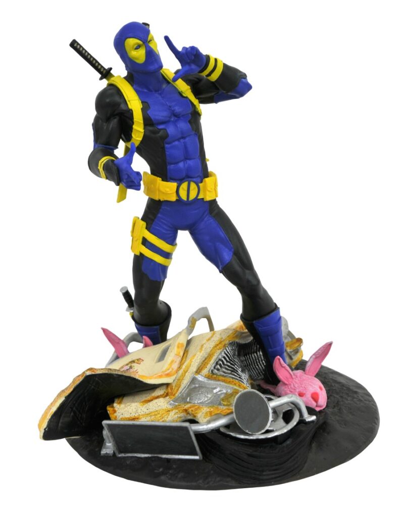 A Diamond Select Toys release! Deadpool returns to the Marvel Gallery line in style! Unfortunately, his ride got trashed along the way, and Deadpool is posed atop a destroyed taco truck base, sporting bunny slippers and wielding twin finger guns with the safeties off! This all-new sculpt spotlighting the softer side of Deadpool stands approximately 10 inches tall and is made of high-quality PVC with collectible-quality paint applications, and this Showcase-exclusive variant depicts him in his blue-and-yellow X-Men colors! Packaged in a full-color window box, it’s limited to only 1200 pieces. Designed by Caesar, sculpted by Cortes Studios! SRP: $50.00