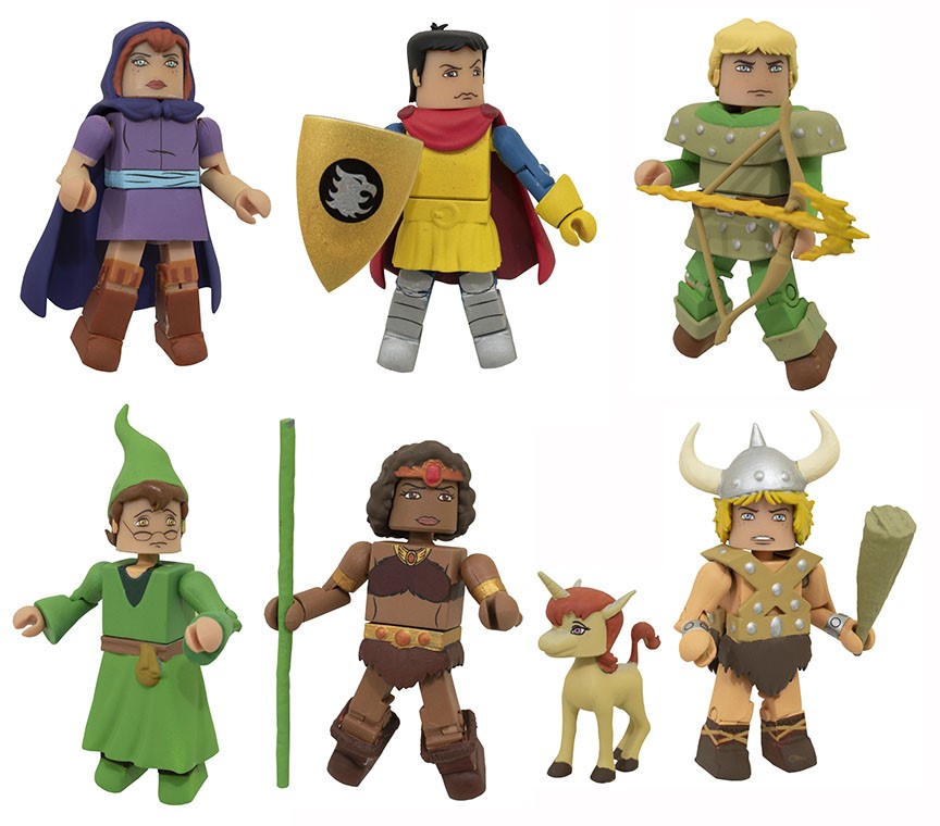 A Diamond Select Toys release! Enter the Dragons! Diamond Select Toys’ first product from Dungeons & Dragons comes to you from the animated world of the D&D cartoon of the 1980s! This deluxe box set of six 2-inch Minimates includes the entire team of heroes: Bobby the Barbarian, Diana the Acrobat, Eric the Cavalier, Hank the Ranger, Presto the Magician and Sheila the Thief! Plus, get a tiny figurine of Uni the Unicorn! Each Minimate features multiple points or articulation and character-specific accessories, and all parts are fully interchangeable! They come packaged in a full-color, book-styled window box with a fifth-panel cover. Designed and illustrated by Barry Bradfield! Coming Soon: The Villains! SRP: $50.00