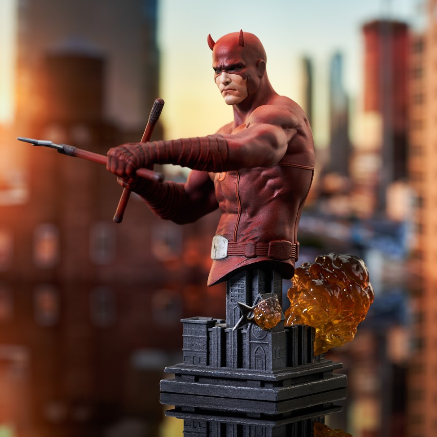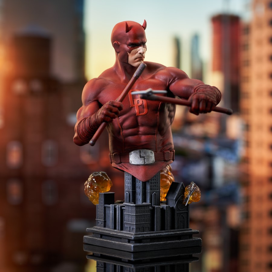 A Diamond Select Toys release! Hell’s Kitchen is burning, and Daredevil is there to stop it! This 1/7 scale, approximately 6-inch diorama of the Man Without Fear depicts him wielding his billy clubs, with a ninja star stuck in one of them, all atop a base depicting a flaming New York City neighborhood. Limited to only 3000 pieces, this bust comes packaged in a full-color box with a numbered certificate of authenticity. Designed by Nelson X. Asencio, sculpted by Juan Pitluk! SRP: $90.00