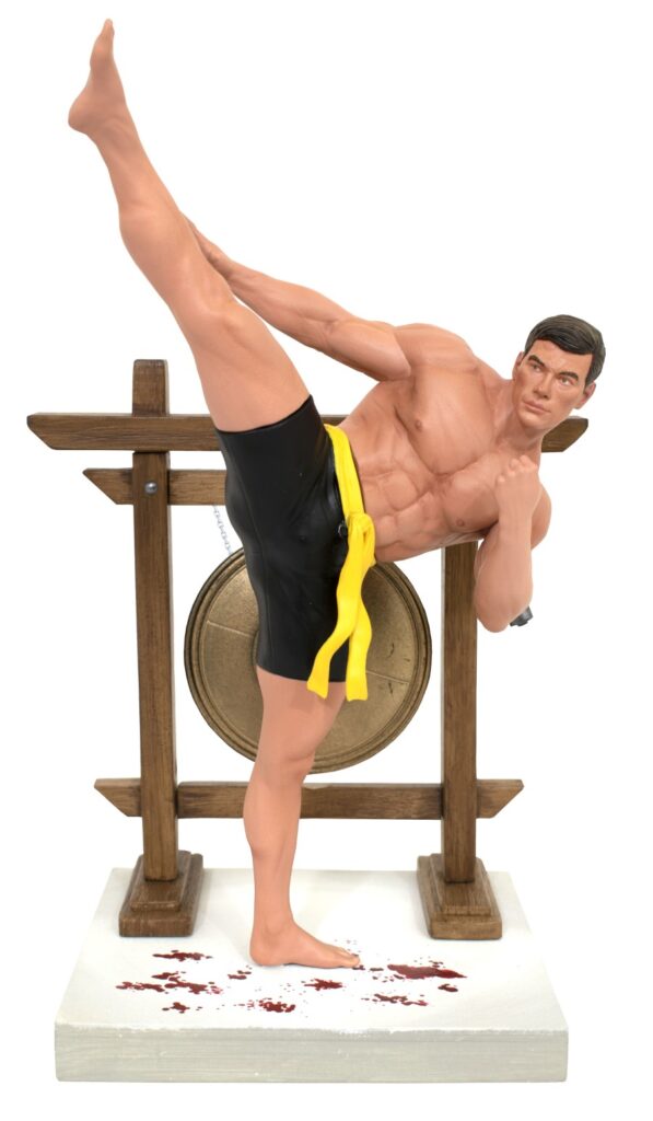 A Diamond Select Toys release! The Legend begins! Diamond Select Toys kicks off a new line of Jean-Claude Van Damme collectibles with this Gallery Diorama of the Muscles from Brussels in one of his iconic, superhumanly balanced poses! Demonstrating one of his famous high kicks in front of a gong, the young JCVD stands approximately 10.5 inches tall and is made of high quality PVC. It comes packaged in a full color window box. Designed by Eamon O’Donoghue, sculpted by Rocco Tartamella! SRP: $49.99