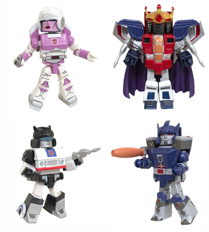 A Diamond Select Toys release! You’ve got the touch! The Transformers Minimates line continues, with a new, third set of 2-inch poseable figures! Autobots Jazz and Arcee face off against Decepticons Galvatron and Coronation Starscream, each with 12-14 points of articulation, and each featuring fully interchangeable parts! All four come packaged on a full-color blister card. Designed by Barry Bradfield! SRP: $29.99