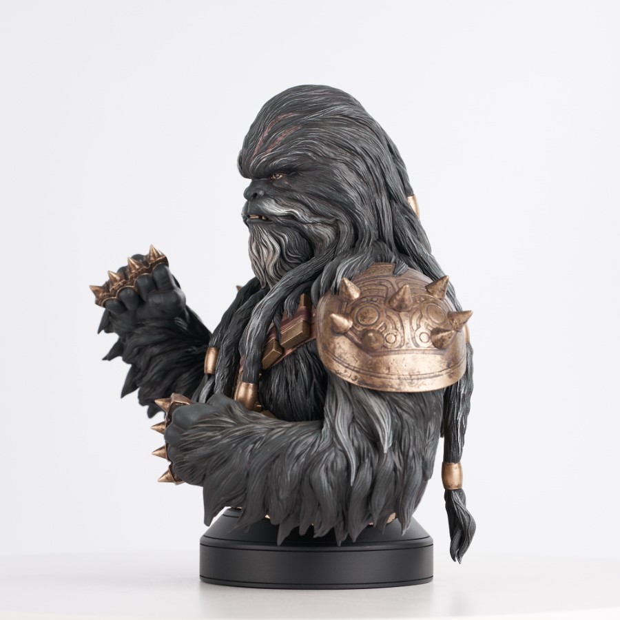 A Gentle Giant LTD release! Let the Wookiee win! Your chances of victory in any battle are increased tenfold when you have a Wookiee on your side, and the black-furred Krrsantan proves the rule. A former gladiator employed by the Hutts, Krrsantan came over to Boba Fett’s side and aided in the defense of Mos Espa from the Pyke Syndicate. This approximately 6-inch resin bust features detailed sculpting and paint applications, and is limited to only 1000 pieces. It comes packaged with a numbered certificate of authenticity in a full-color box. SRP: $150.00