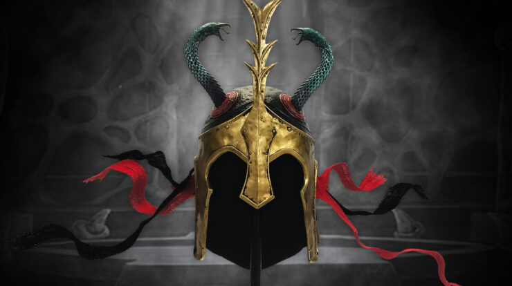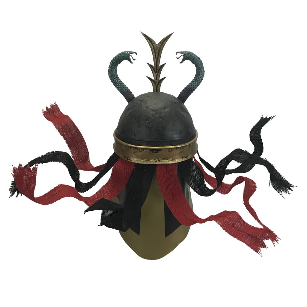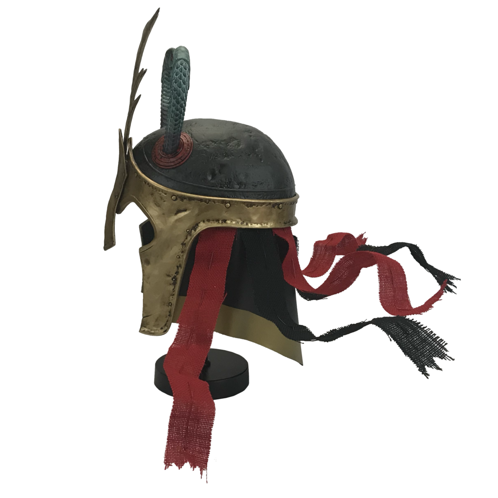 Fabric ribbons accentuate the exterior of the helmet and have been aged to imitate ancient tomb wrappings. Each one is individually wired, allowing it to be independently posed, and when fully extended, this replica stretches an impressive 35-inches wide.